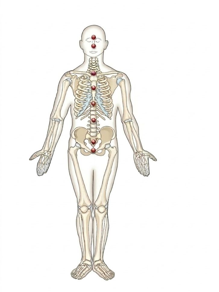 Die Punkte am Rücken stehen für deine Vergangenheit, deine Herkunft und dein Fundament. Die Rückseite ist deine Stütze - der Teil von dir, der dir "den Rücken stärkt". Sie sind essenziell für unsere Aufrichtung sowie Statik des Körpers. Sie helfen dabei, Altes loszulassen und Belastungen abzugeben.